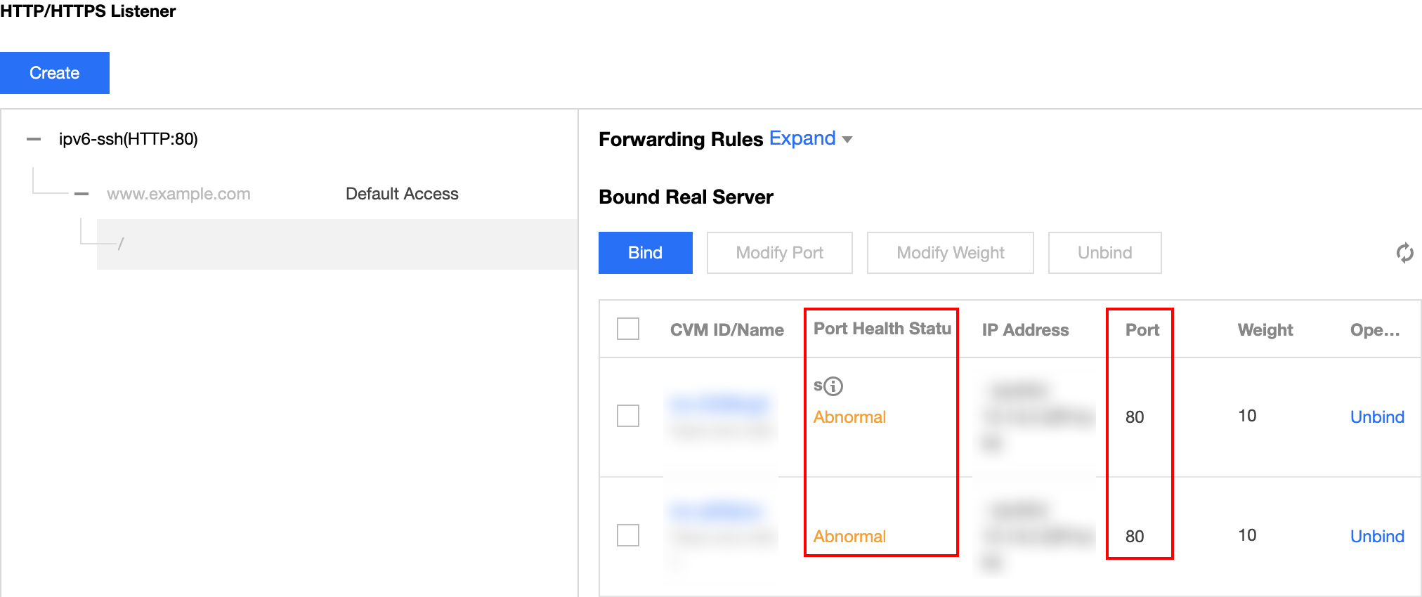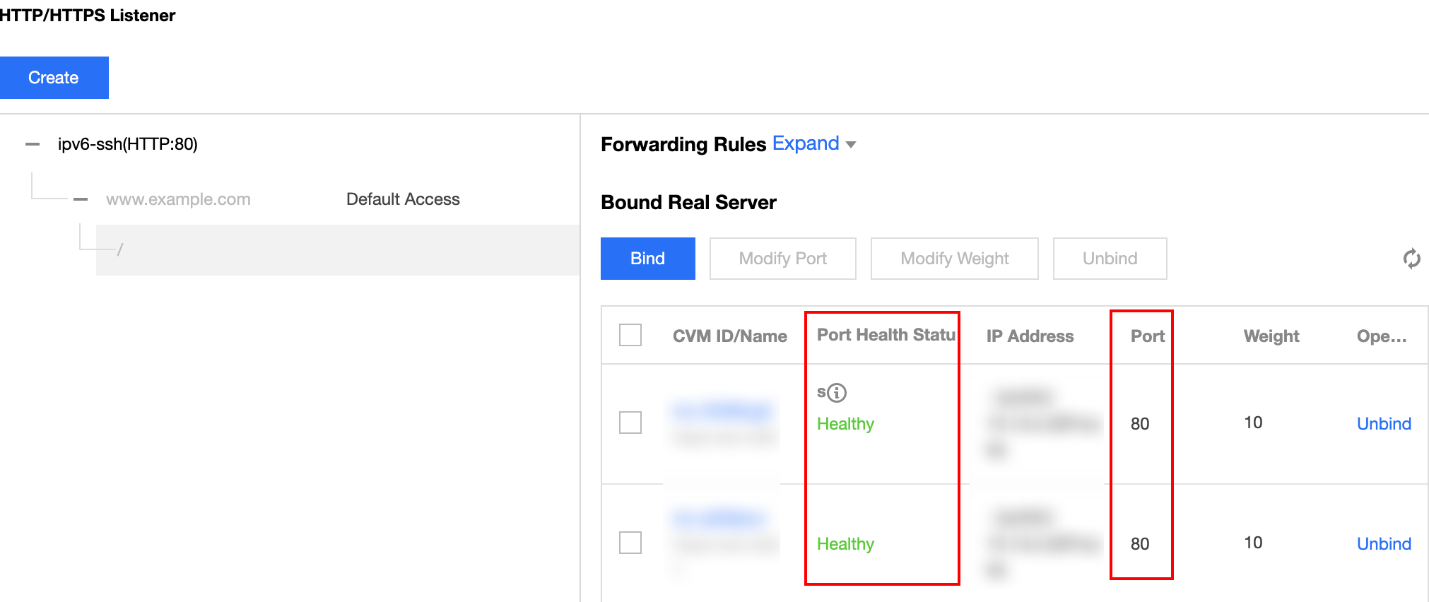 1. Na página "Listener Management (Gerenciamento de listener)", selecione e expanda o listener recém-criado e selecione o nome de domínio e o caminho do URL, e as informações IPv6 da instância do CVM associada ao caminho do URL serão exibidas à direita. Clique em Bind (Vincular).