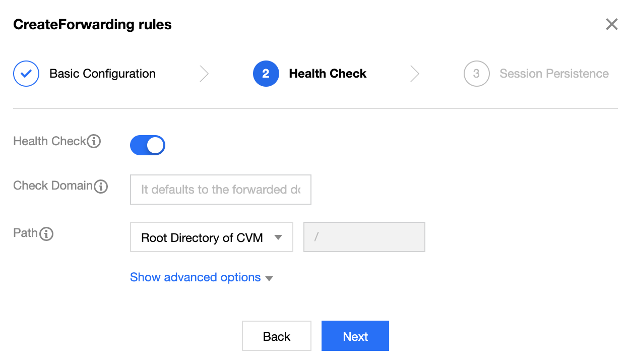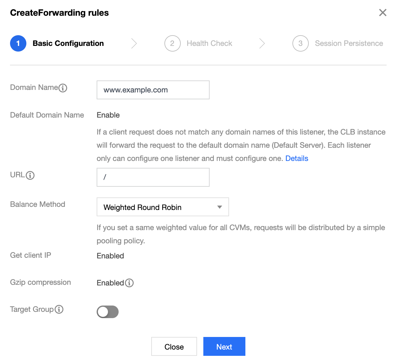 2. Na caixa pop-up, configure o nome do domínio, o caminho do URL, o método de balanceamento e clique em Next (Avançar).