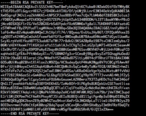 A chave privada RSA pode incluir todas as chaves privadas (RSA e DSA), chaves públicas (RSA e DSA) e certificados (X.509). Ela armazena dados no formato DER codificado em Base64 e é agrupada por cabeçalhos ASCII, tornando-a adequada para transmissão em modo de texto entre sistemas.