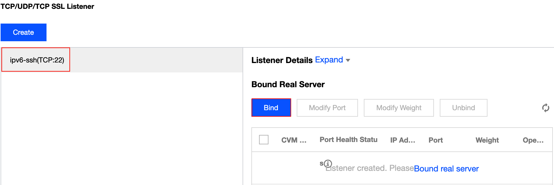 Na lista à esquerda do módulo de listener TCP/UDP/TCP SSL, selecione o listener a ser vinculado a um servidor de back-end e clique em Bind (Vincular).