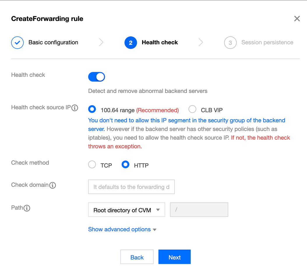 Persistência da sessão: se a persistência da sessão estiver desativada e um método round-robin for selecionado, as solicitações do mesmo cliente serão atribuídas a diferentes servidores de back-end em sequência; se a persistência da sessão estiver ativada, ou desativada, mas o método de balanceamento ip_hash for usado, as solicitações do mesmo cliente sempre serão atribuídas ao mesmo servidor de back-end.