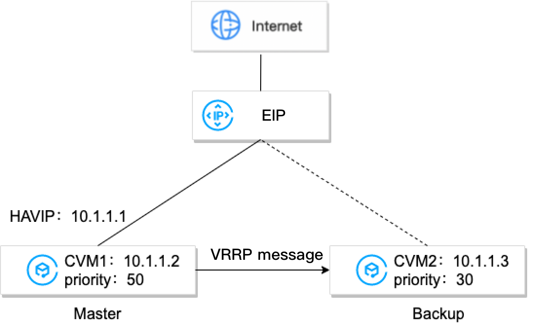 Em uma VPC, um cluster principal/secundário de alta disponibilidade também pode ser implementado ao implantar o Keepalived em CVMs. No entanto, uma instância da CVM geralmente não pode obter um IP privado por meio de anúncio ARP por motivos de segurança, como falsificação de ARP. O VIP deve ser um HAVIP solicitado da Tencent Cloud, que é específico da sub-rede. Portanto, o HAVIP só pode ser vinculado a um servidor na mesma sub-rede por meio de anúncio.