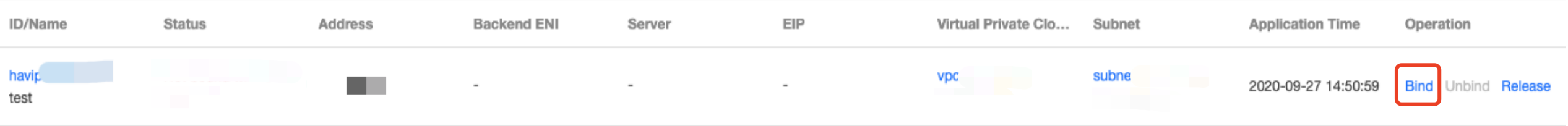 1. Faça login no console do HAVIP, localize o HAVIP solicitado na Etapa 1 e clique em Bind (Vincular). 2. Na caixa de diálogo pop-up, selecione o EIP a ser vinculado e clique em OK. Se nenhum EIP estiver disponível, primeiro acesse o console do EIP para solicitar. Etapa 5: usar o notify_action.sh para registro em log simples (opcional)