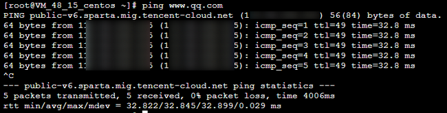 2. Execute o comando ping <public IP address>, como ping www.qq.com para testar a conectividade da rede pública.