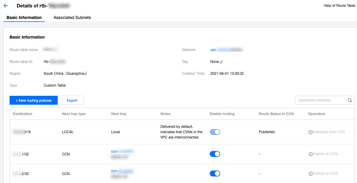 Destino | O intervalo de IP de destino para o qual o tráfego será encaminhado. A configuração deve atender aos seguintes requisitos: Insira um intervalo de IP. Se você quiser inserir um único IP, defina a máscara para 32 (por exemplo, `172.16.1.1/32`). O destino não pode ser um intervalo de IP do VPC onde a tabela de rotas está localizada, porque a rota local já permite a interconexão de rede privada neste VPC. Observação: se você tiver implantado um serviço TKE no VPC, o destino que você configurar na política da tabela de rotas da sub-rede do VPC não poderá estar dentro do bloco CIDR do VPC ou conter o intervalo de IP do TKE. Por exemplo, se o bloco CIDR do VPC for `172.168.0.0/16` e o bloco CIDR do TKE for `192.168.0.0/16`, o intervalo de IP de destino não deve estar dentro de `172.168.0.0/16`, ou conter `192.168.0.0/16`, quando você configurar a política de roteamento para uma sub-rede do VPC. |