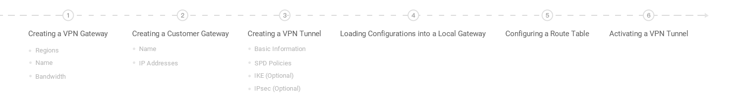 Um VPN Connection é um método para conectar seus IDCs e instâncias do VPC por meio de túneis criptografados de rede pública. Um VPN Connection consiste em três partes: gateway VPN, gateway do cliente e túnel VPN.