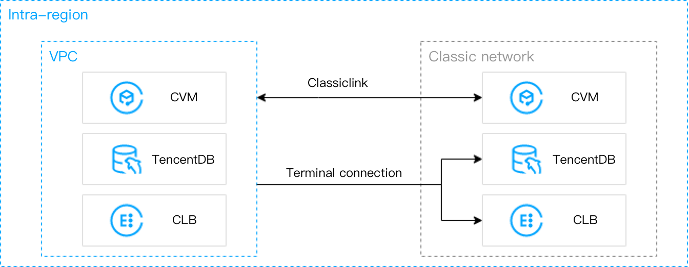 Tanto a rede clássica quanto a VPC são espaços de rede na nuvem. A VPC é mais seguro e controlável. Embora a maioria das CVMs esteja implantada em VPCs da Tencent Cloud, algumas aplicações ainda estão sendo executadas na rede clássica que precisa de interconexão com a VPC. Para resolver esse problema, a Tencent Cloud fornece a seguinte solução.