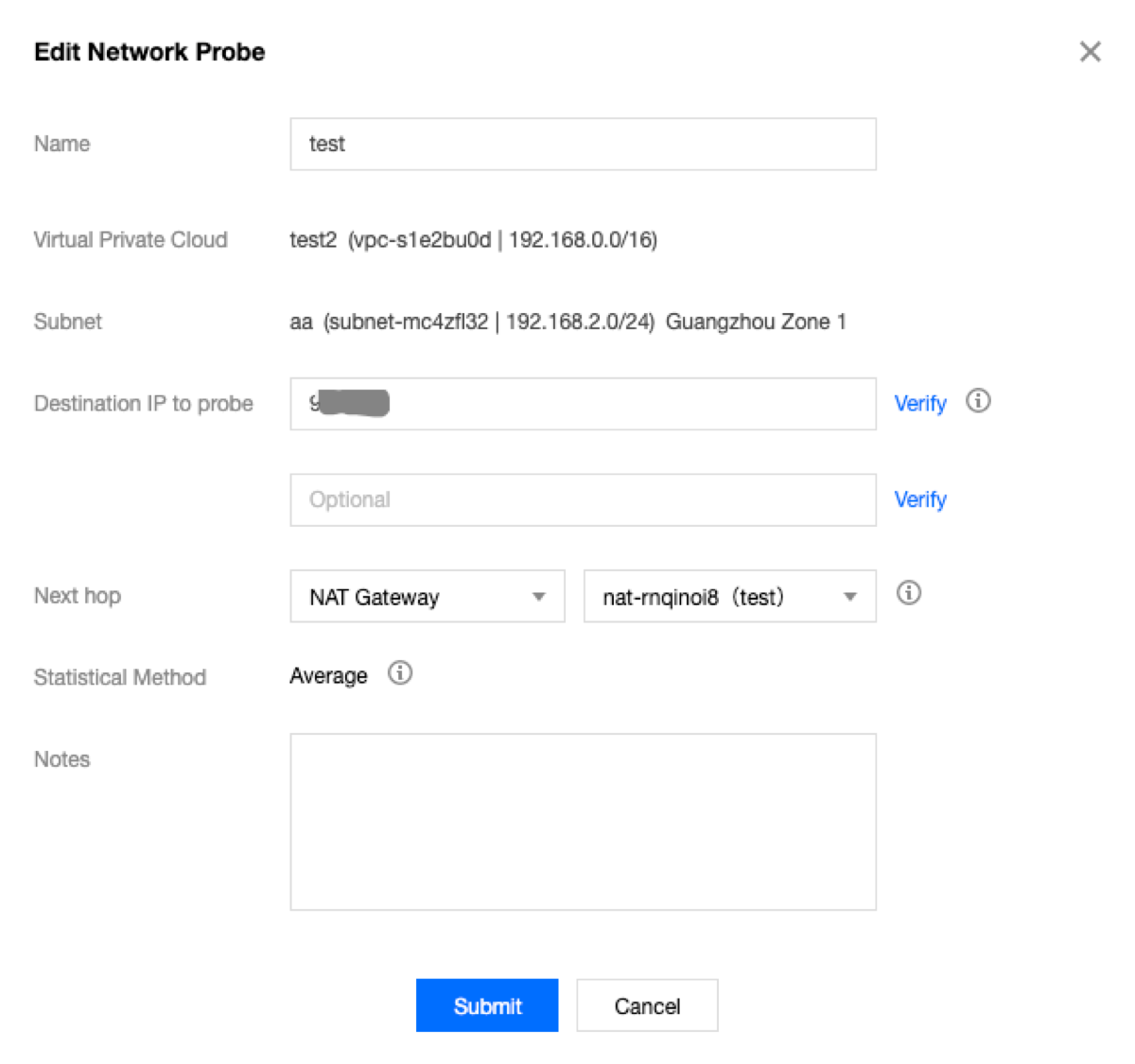 4. Na janela pop-up Edit Network Probe (Editar sonda de rede), faça as alterações necessárias e clique em Submit (Enviar) para salvar as alterações.