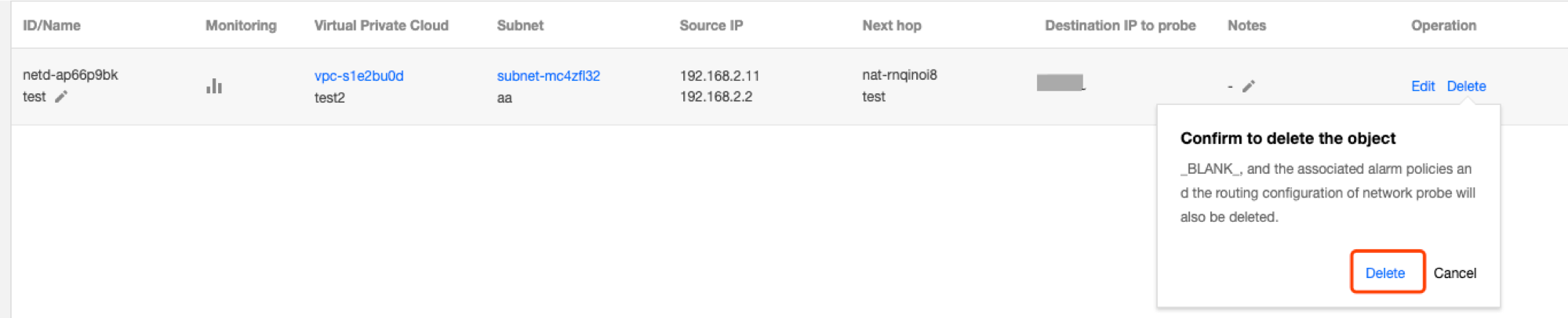 3. Na lista, localize a sonda de rede a ser excluída e clique em Delete (Excluir) na coluna Operation (Operação).