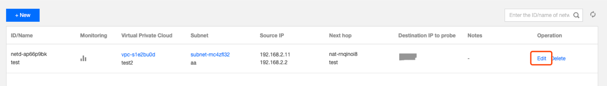 3. Na lista, localize a sonda de rede a ser modificada e clique em Edit (Editar) na coluna Operation (Operação).