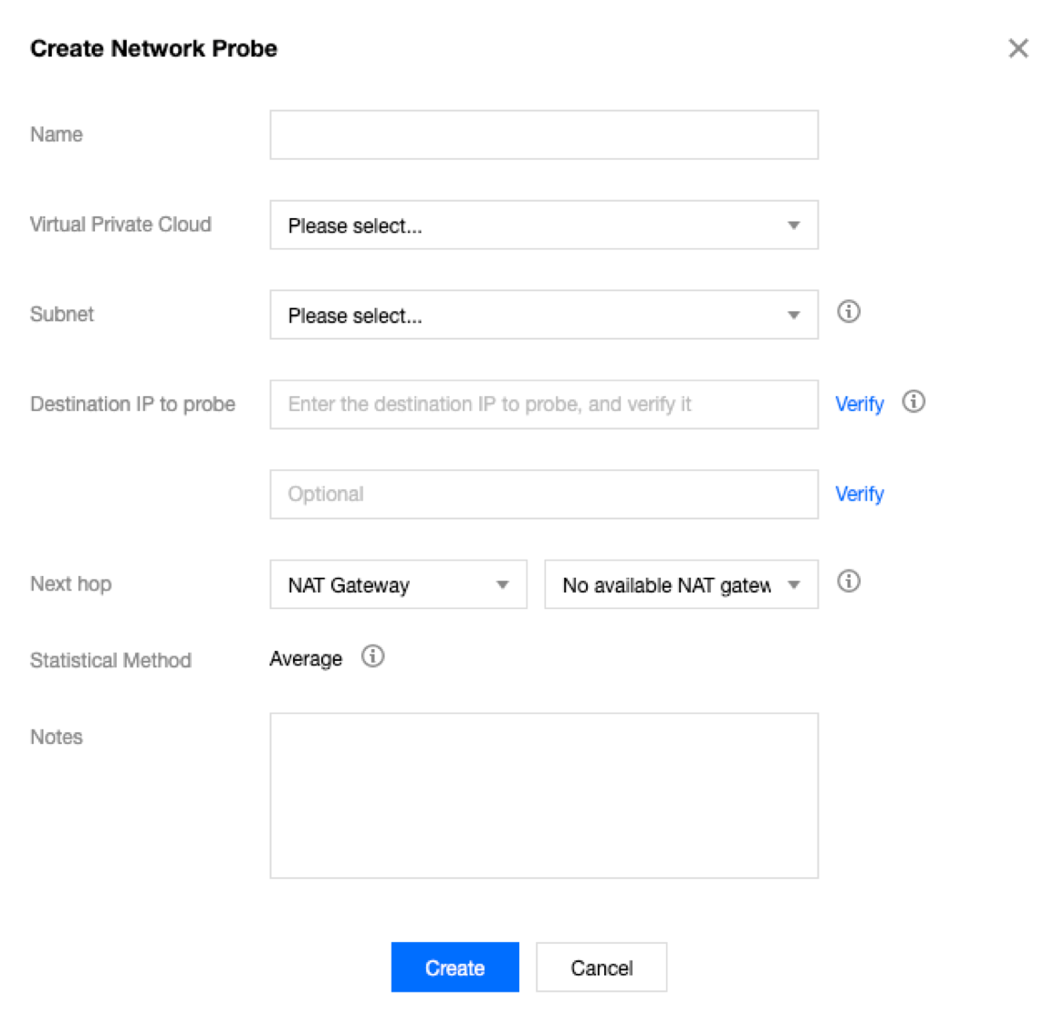 Source Next Hop (Próximo salto de origem) | Você pode escolher Specify (Especificar) ou Do Not Specify (Não especificar) o próximo salto. Se Do Not Specify (Não especificar)for marcado, nenhum próximo salto será selecionado. Nota: Atualmente, a opção Do Not Specify (Não especificar) só está disponível para usuários beta. Para ativá-la, envie um tíquete. Se você especificar o próximo salto, selecione o tipo do próximo salto e as instâncias. Depois, o sistema adiciona automaticamente a rota de 32 bits correspondente à tabela de rotas associada à sub-rede. Atualmente, o tipo do próximo salto aceito inclui NAT Gateway, Peering Connections, gateway do VPN, gateway do Direct Connect, CVM e CCN. Nota: Se você especificar o CCN como o próximo salto e os IPs de destino da sonda pertencerem a dois VPCs no CCN, o intervalo de IP com a máscara mais longa será correspondido e entrará em vigor.