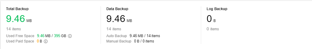Backup total: esta seção exibe o tamanho e a quantidade de todos os backups, dados e logs, bem como a camada gratuita ocupada por todos eles.