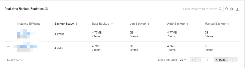 Estatísticas de backup em tempo real: esta seção exibe os IDs/nomes da instância (você pode clicar em um ID/nome para entrar na página de detalhes da instância), espaço de backup (que pode ser classificado por tamanho) e backups de dados/log na região selecionada. Você pode pesquisar uma instância por ID/nome na caixa de pesquisa no canto superior direito.