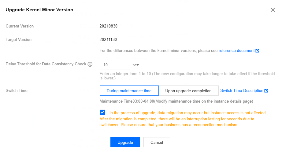 O TencentDB for MySQL permite a atualização automática ou manual de versão secundária do kernel. A atualização adiciona novos recursos, melhora o desempenho e corrige problemas.