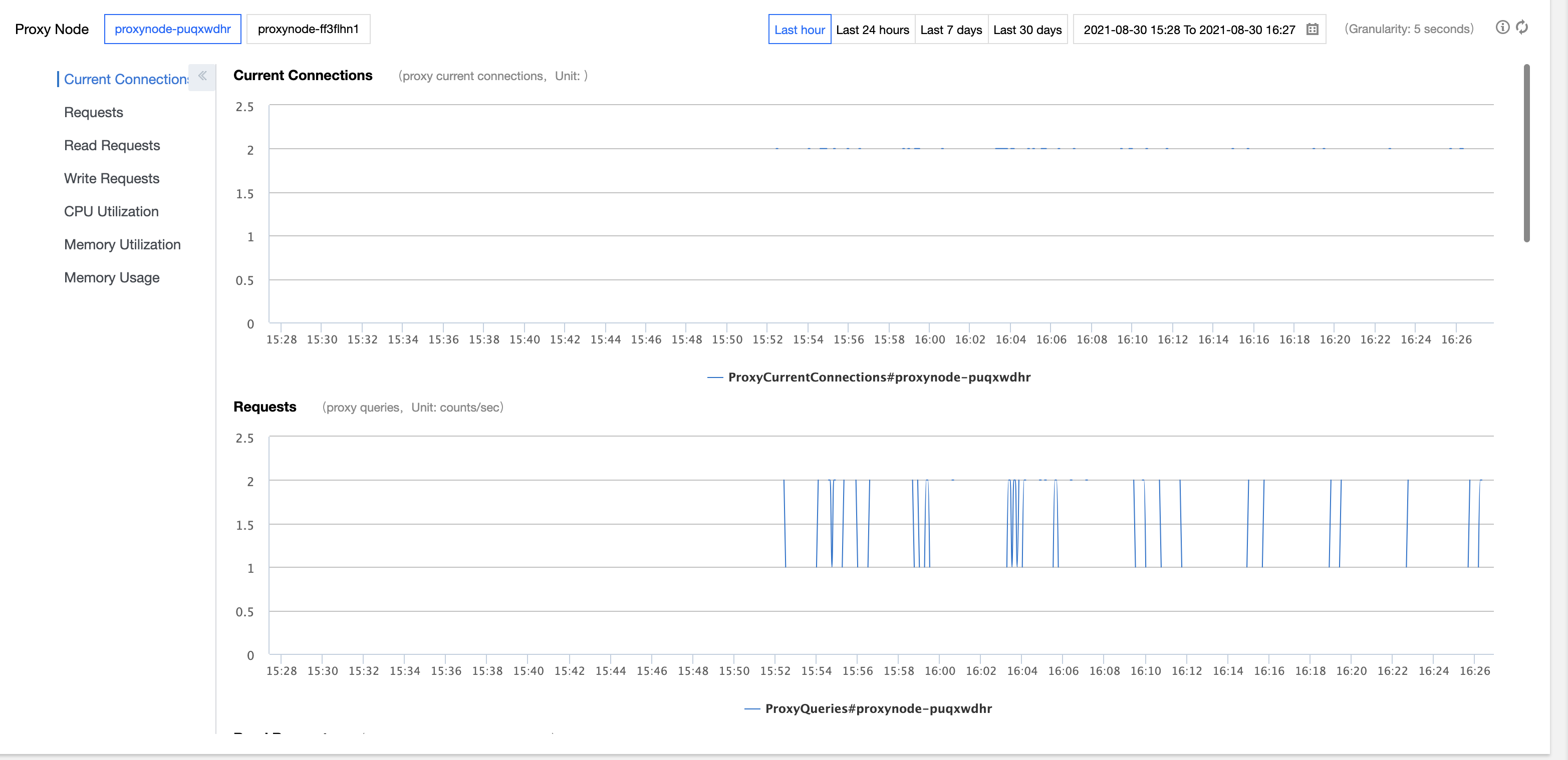 1. Faça login no console do TencentDB for MySQL. Na lista de instâncias, selecione uma instância de origem com proxy ativado e clique no respectivo ID ou em Manage (Gerenciar) na coluna Operation (Operação) para entrar na página de gerenciamento de instâncias. 2. Na página de gerenciamento de instâncias, selecione Database Proxy (Proxy de banco de dados) > Performance Monitoring (Monitoramento de desempenho) e clique em um nome de nó de proxy para visualizar os respectivos dados de monitoramento. Você pode alternar entre diferentes nós clicando em seus nomes.