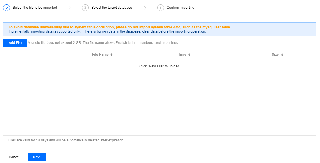 Apenas instâncias do TencentDB for MySQL de dois e três nós permitem a importação de arquivos SQL.