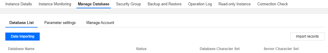 1. Faça login no console do TencentDB for MySQL. Na lista de instâncias, clique em um ID de instância ou em Manage (Gerenciar), na coluna Operation (Operação) para acessar a página de gerenciamento da instância. 2. Selecione Database Management (Gerenciamento de banco de dados) > Database List (Lista de banco de dados) e clique em Import Data (Importar dados).