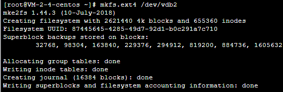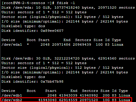 A figura a seguir mostra que a nova partição vdb2 foi criada.
