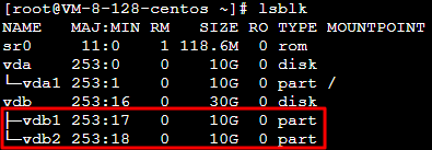 A saída a seguir indica que há duas partições: vdb1 e vdb2. Nesse caso, é necessário escolher uma partição a ser estendida conforme as instruções em expansão manual.