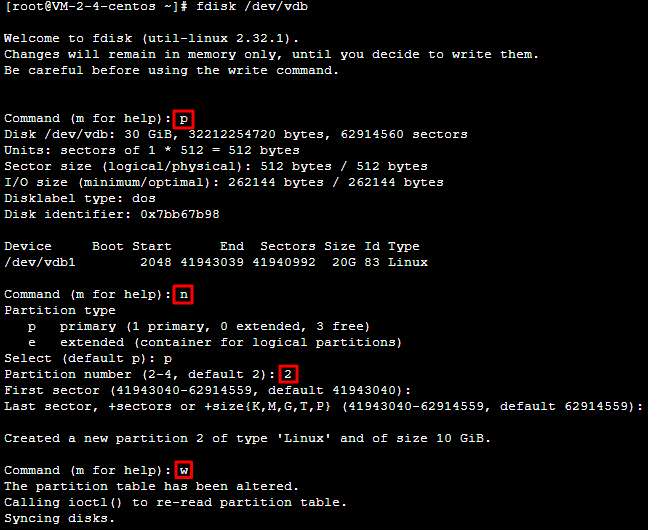 4.1 Digite p para verificar as partições existentes, como /dev/vdb1 neste documento.