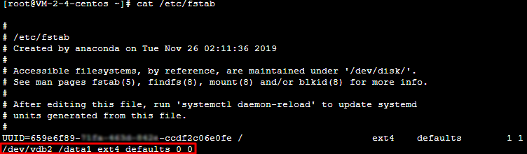 echo '/dev/vdb2 /data1 ext4 defaults 0 0' >> /etc/fstab