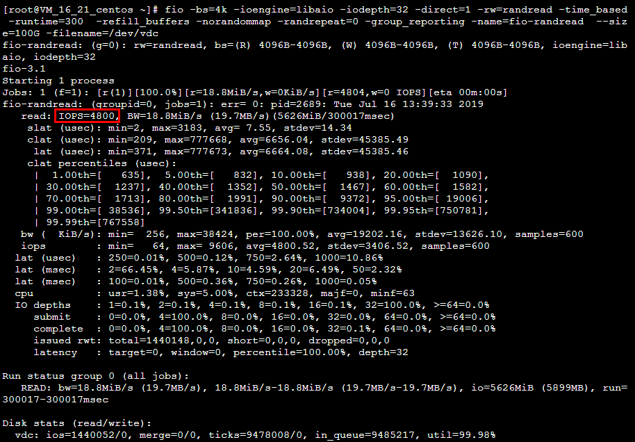 fio -bs=4k -ioengine=libaio -iodepth=32 -direct=1 -rw=randread -time_based -runtime=600 -refill_buffers -norandommap -randrepeat=0 -group_reporting -name=fio-randread-iops --size=10G -filename=/dev/vdb