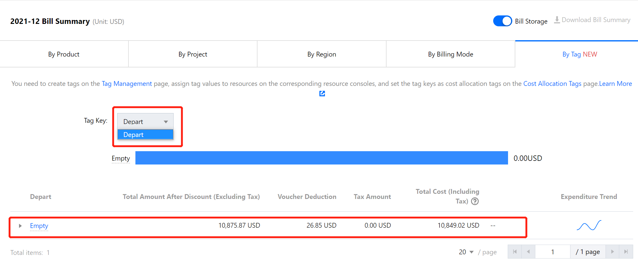 2. On the Bill Overview page, select a specific tag key to view a bar chart and list of related resources aggregated by that tag key.