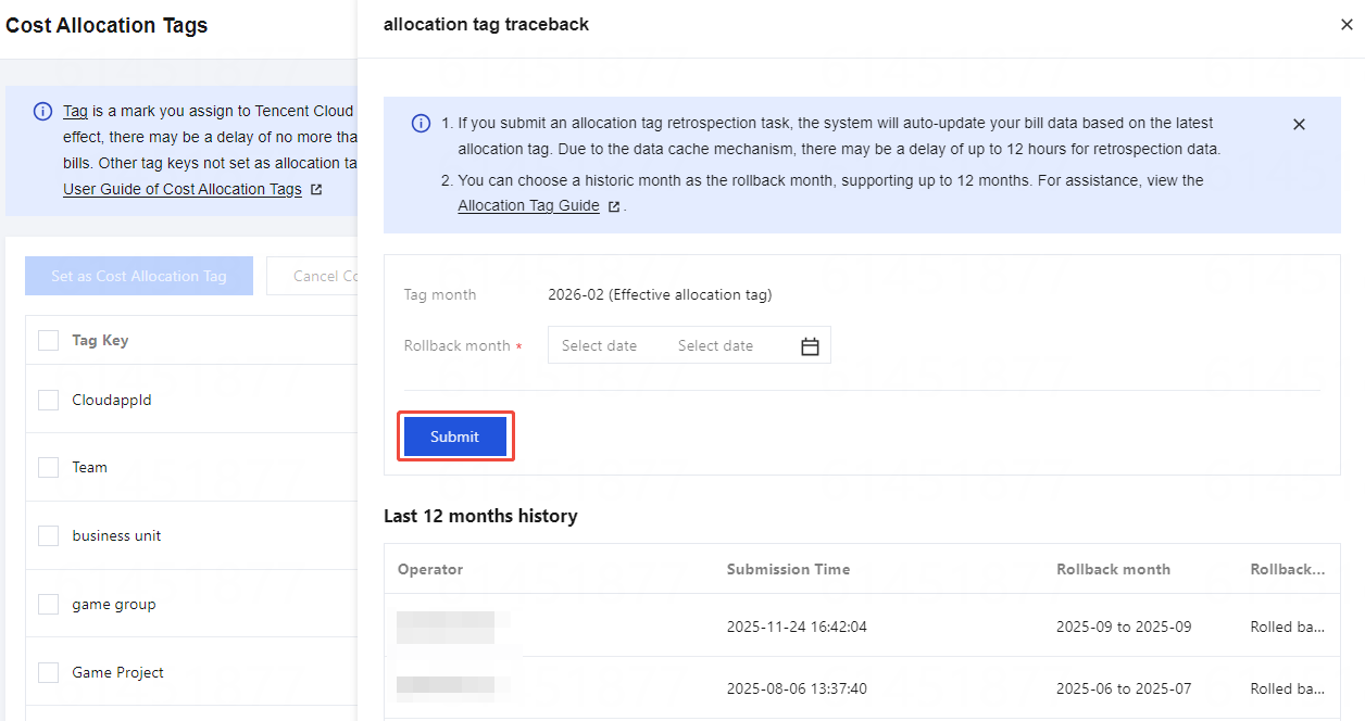 The cost allocation Tag reprocessing capability reprocesses historical monthly cost allocation bills based on the current Tag key designated for cost allocation and the binding relationships between resources and Tags, supporting retroactive cost allocation Tag reprocessing for up to 12 months.