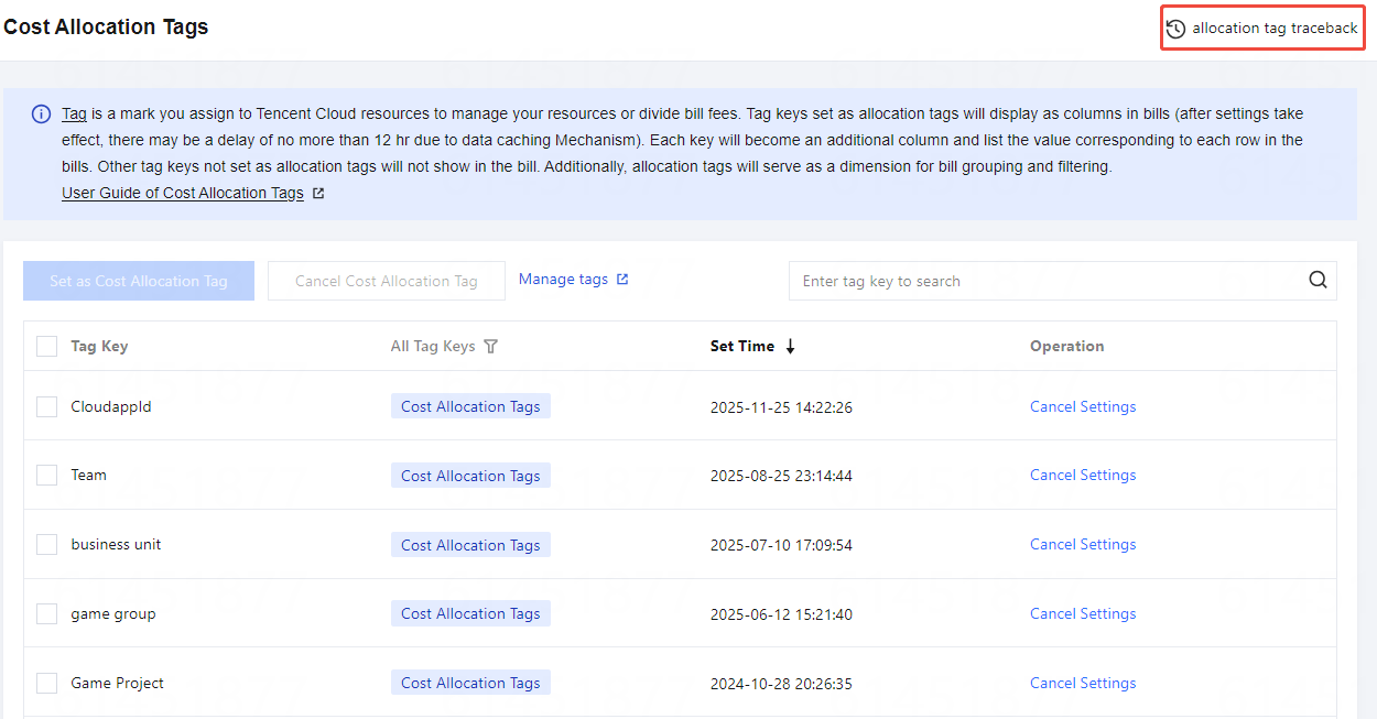 For example, a company may wish to track its cloud resource consumption by different projects. It can create a Tag, bind the created Tag to resources, and designate it as a cost allocation tag. Detailed instructions for cost allocation tags are provided below.