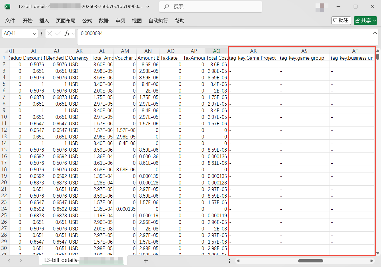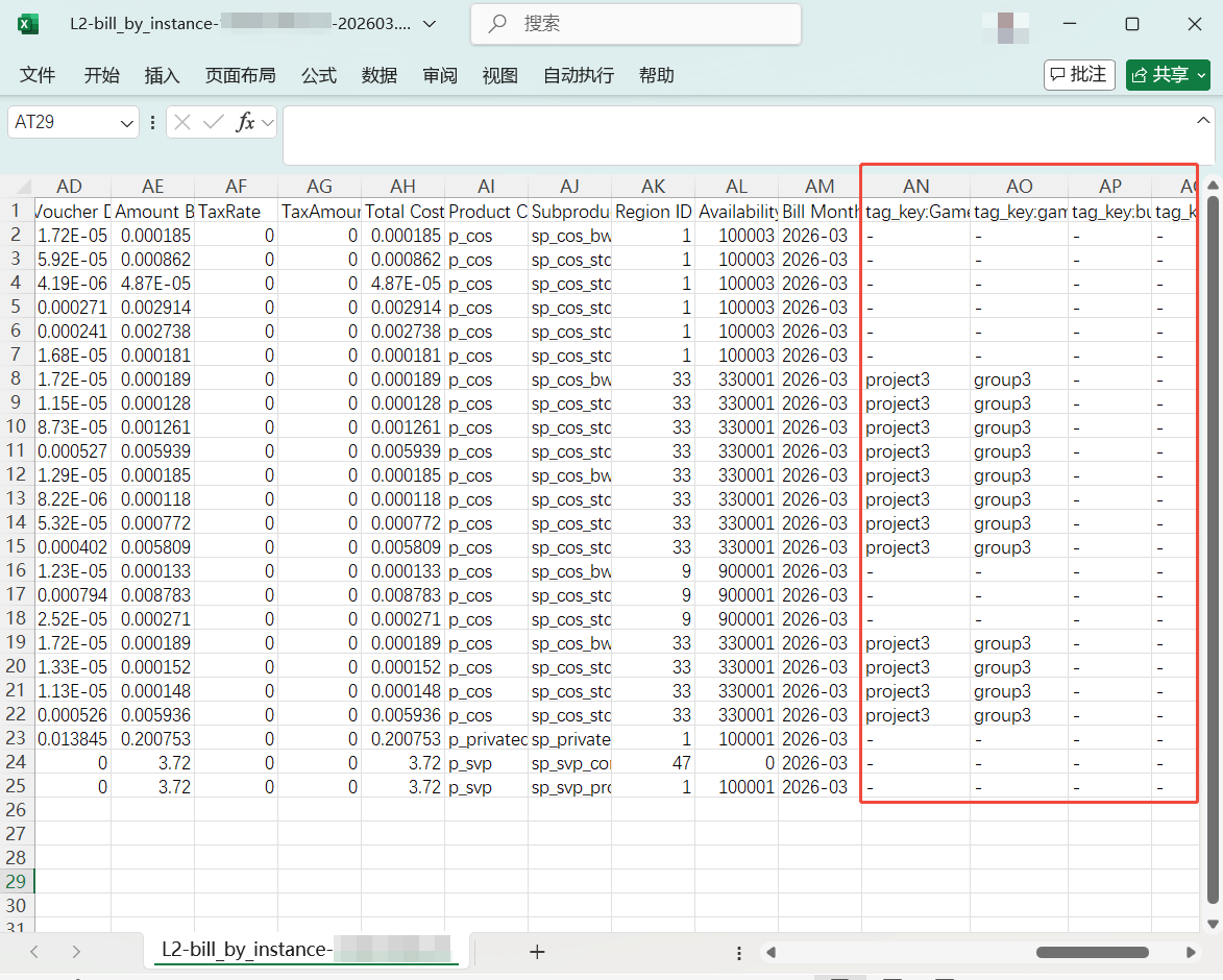 4. In the bill file aggregated by resource ID, you can see the tag key column and the corresponding tag value for each row under that column on the right side of the table. If you have not set a tag value under that tag key for a resource in a particular row, it is displayed as "-".