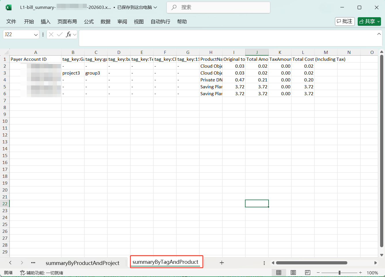 2. In the L1-level file, you can see a sheet named: Aggregated by Tag + Product Name. In this sheet, you can view billing content aggregated by tag key. If you have not set a tag value under that tag key for a resource in a particular row, that row will be displayed as empty.