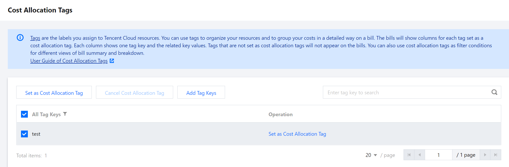 A maximum of 15 cost allocation tags can be set. It is recommended to select only one tag key as the cost allocation tag, as a smaller number facilitates easier management of your expenses. Tag keys designated as cost allocation tags will be displayed as separate columns in bills, allowing you to filter and categorize bills based on these tag keys.