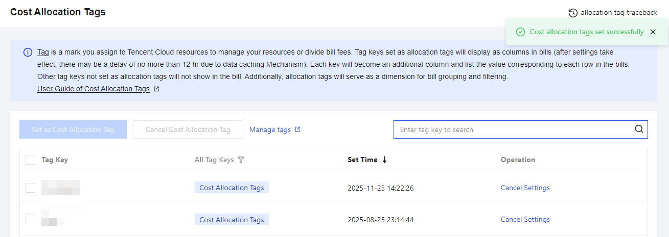 3. On the Cost Allocation Tags page, select the tag key you want to operate on, and click Set as Cost Allocation Tag.