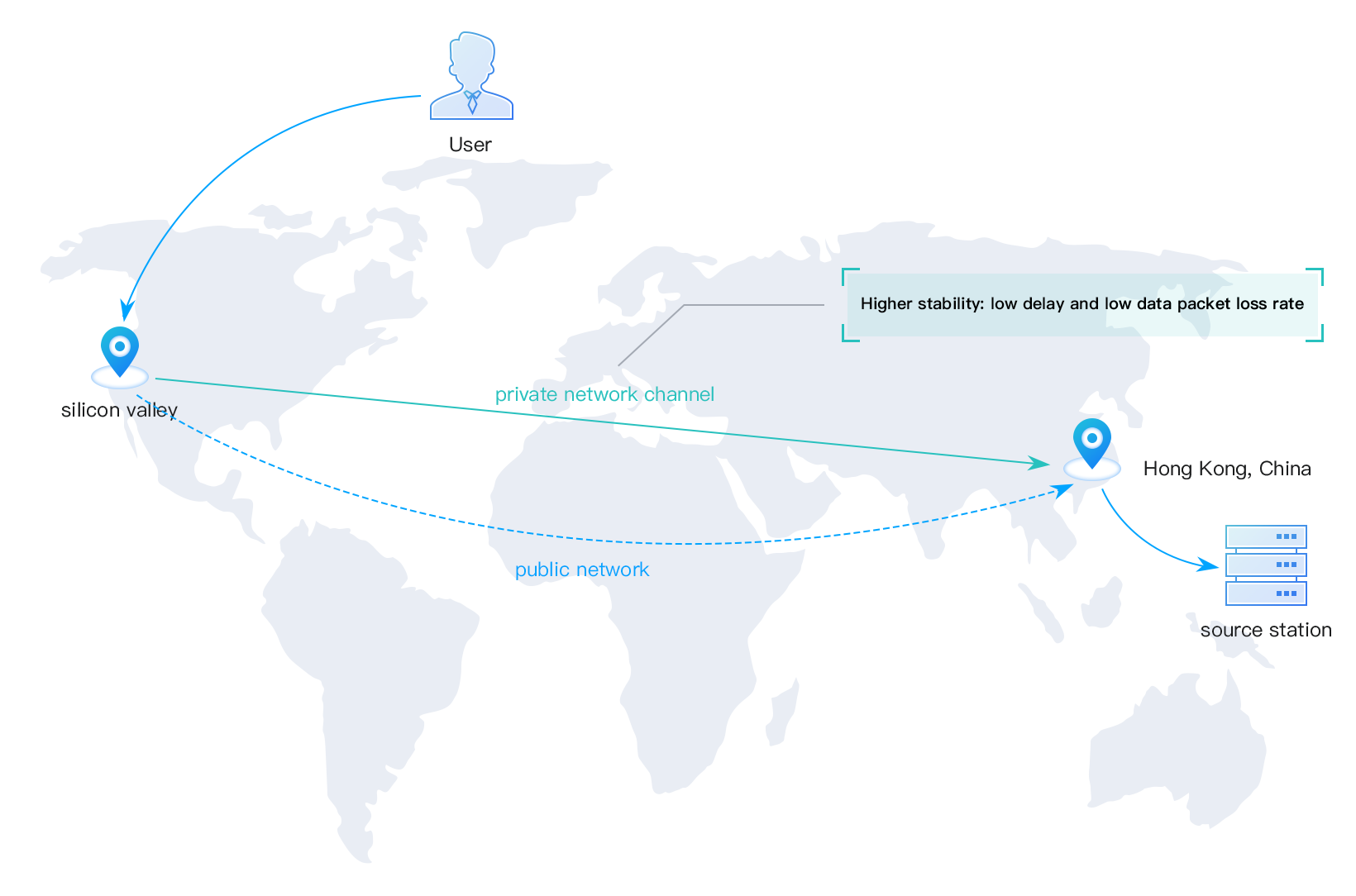 Para negócios que requerem acesso entre origens, as condições de rede diferentes das regiões costumam resultar em maior atraso e perda de pacotes e, consequentemente, afetar a experiência do usuário no acesso ao negócio. O GAAP pode criar conexões de alta velocidade entre a região de aceleração (região onde o usuário está localizado) e a região do servidor de origem (região onde o servidor está localizado), o que pode efetivamente reduzir a latência da rede e a perda de pacotes e garantir uma rede rápida e estável, e assim, oferece uma melhor experiência do usuário.