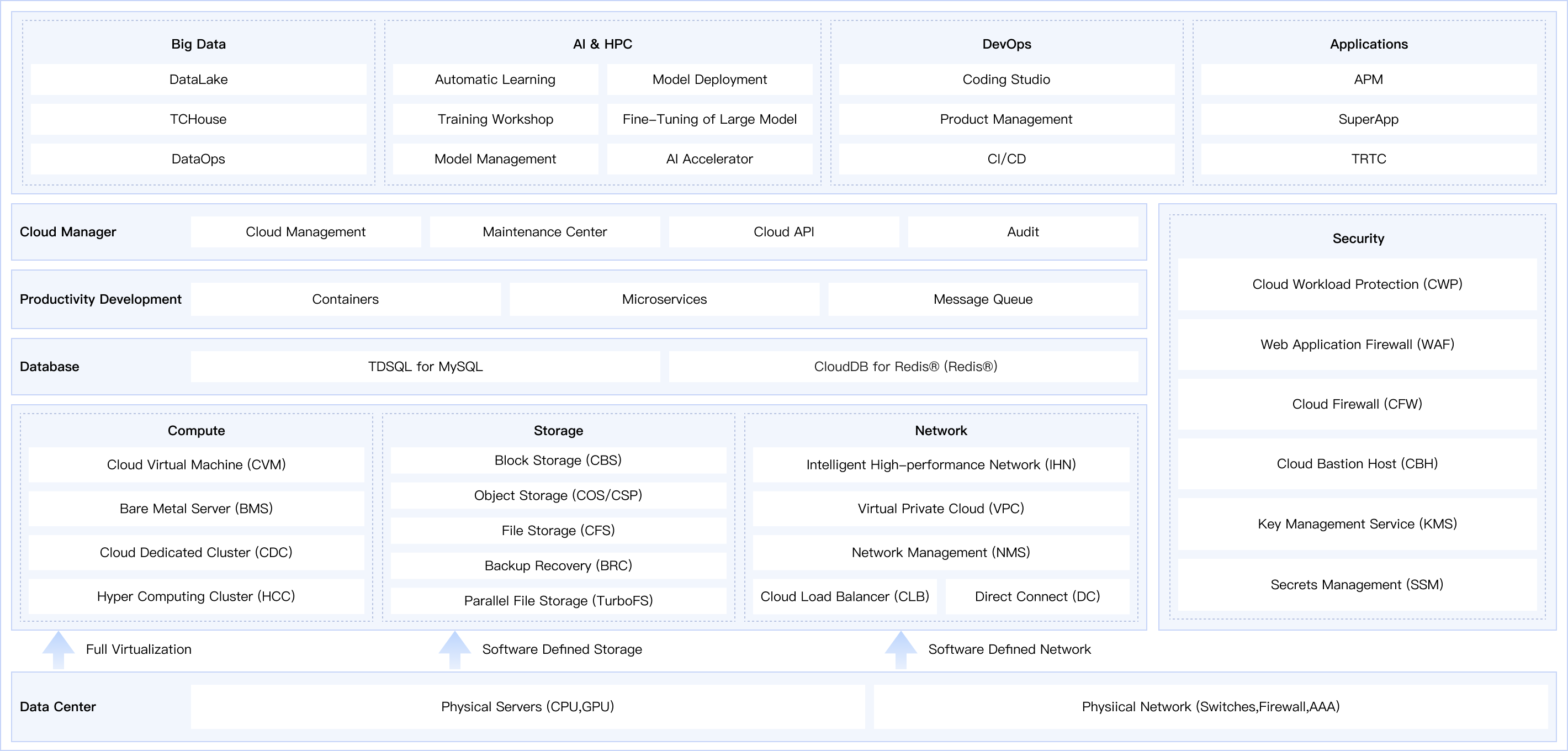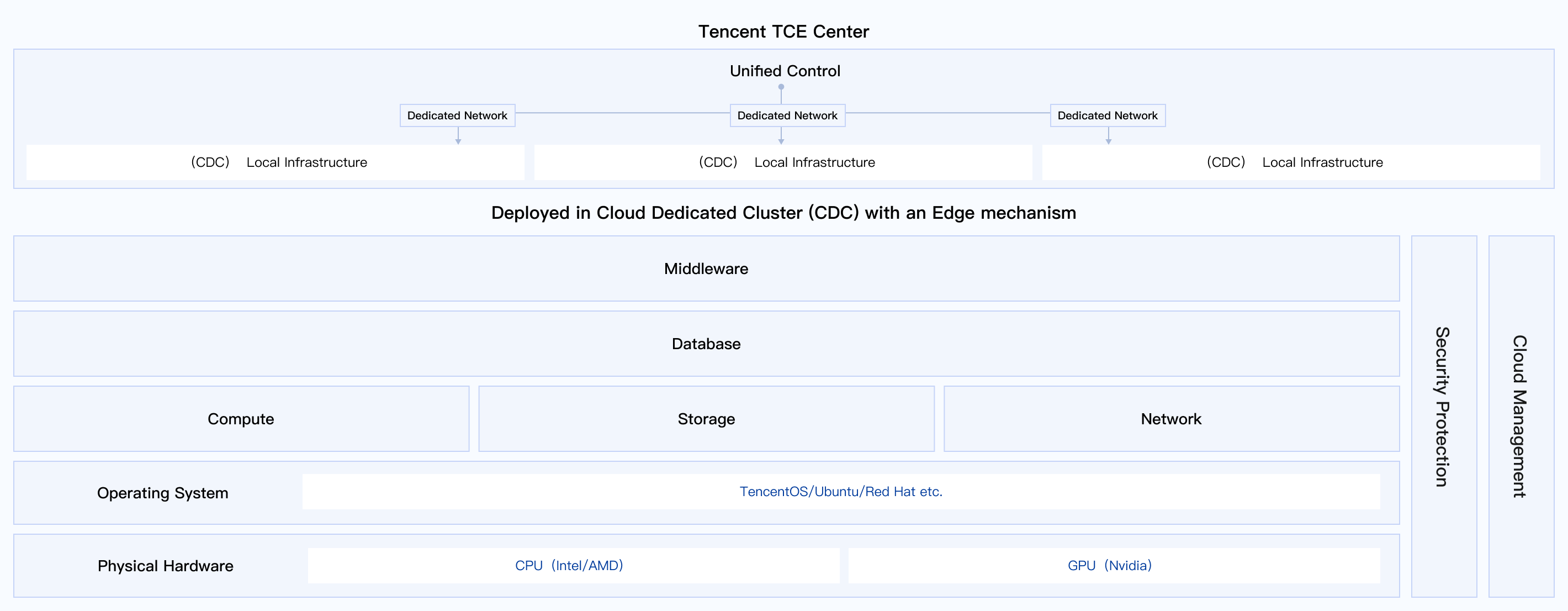 Tencent TCE is a private cloud developed based on the mature technical system of Tencent Cloud. It is a full-stack cloud platform that provides comprehensive IaaS, PaaS, and cloud management capabilities, addressing enterprise cloud demands and powering tailored industry solutions for various scenarios.