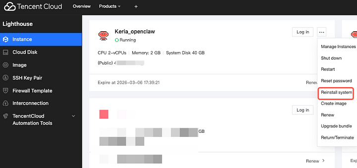 If your Tencent Cloud account already has an existing Lighthouse server instance and you wish to install OpenClaw on that server, and the old data on that server does not need to be retained, you can use the “Reinstall System” method for installation. Detailed steps are described below.