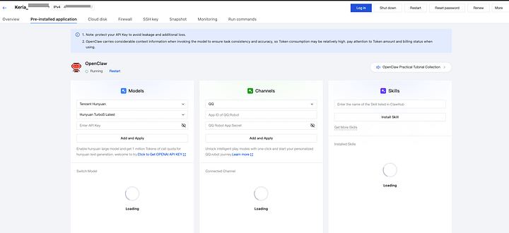 Next, you can configure the model, OpenClaw Channel (including QQ, WeChat Work, DingTalk, and Lark), and OpenClaw Skills on the interface.