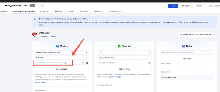 After creating the API Key, return to the server application management page, copy the API Key and paste it into the “Models — API Key” input box in the panel, then click the Add and Apply button to save the model API Key configuration.