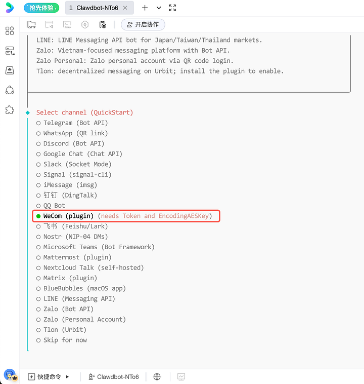 (Optional) If you are familiar with command line operations, Tencent Cloud also supports configuring the access to various applications using the default onboard method provided by the OpenClaw community (currently, access to overseas applications such as Telegram, Discord, and WhatsApp requires command line operation). After remotely logging into the server, execute the “clawdbot onboard” command and select the corresponding application as shown in the figure below.