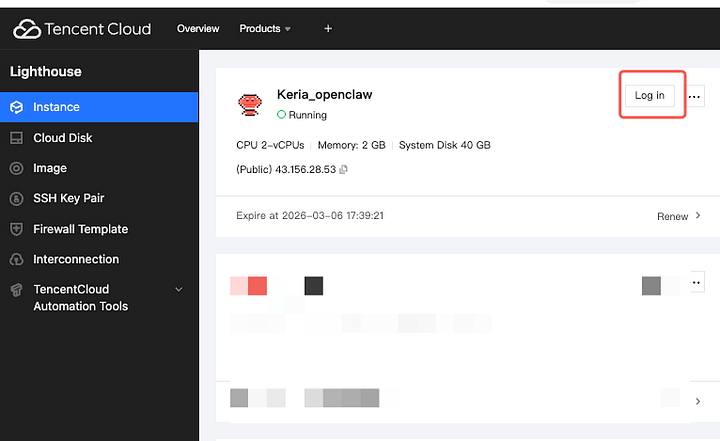 First, go to the Lighthouse console to find the purchased or reinstalled OpenClaw instance, and click the login button on the page: