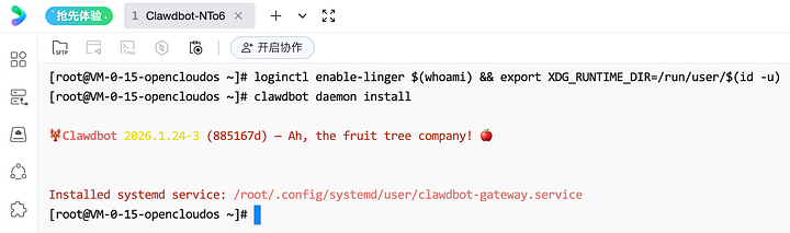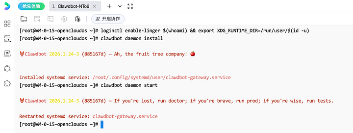 The reason for this is that the commands run in the previous steps were only “temporarily executed.” Therefore, after completing the preliminary configuration, we need to run OpenClaw (Clawdbot) in the background so that we can maintain communication with it even after closing the server’s command-line interface (OrcaTerm).