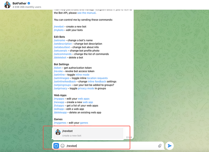 In the BotFather chat mentioned above, click the location shown in the image to open the Bot chat window.
