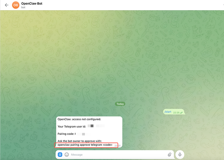 During the initial conversation, a pairing code will be sent. Run the command below to complete the pairing process.