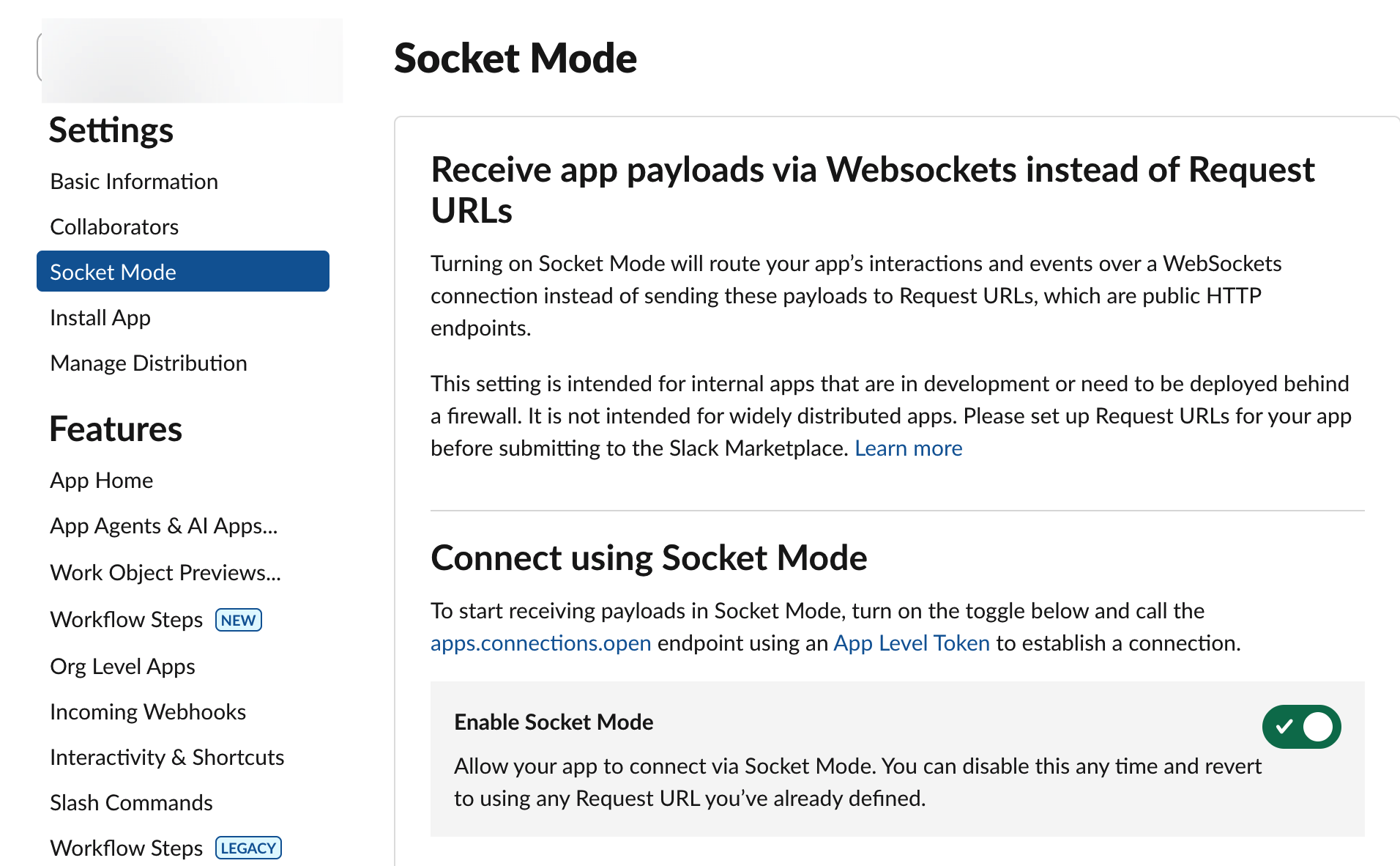 In the App configuration page, find Socket Mode in the left navigation bar and click to enable Socket Mode. Only after enabling Socket Mode can the Bot communicate with Slack.
