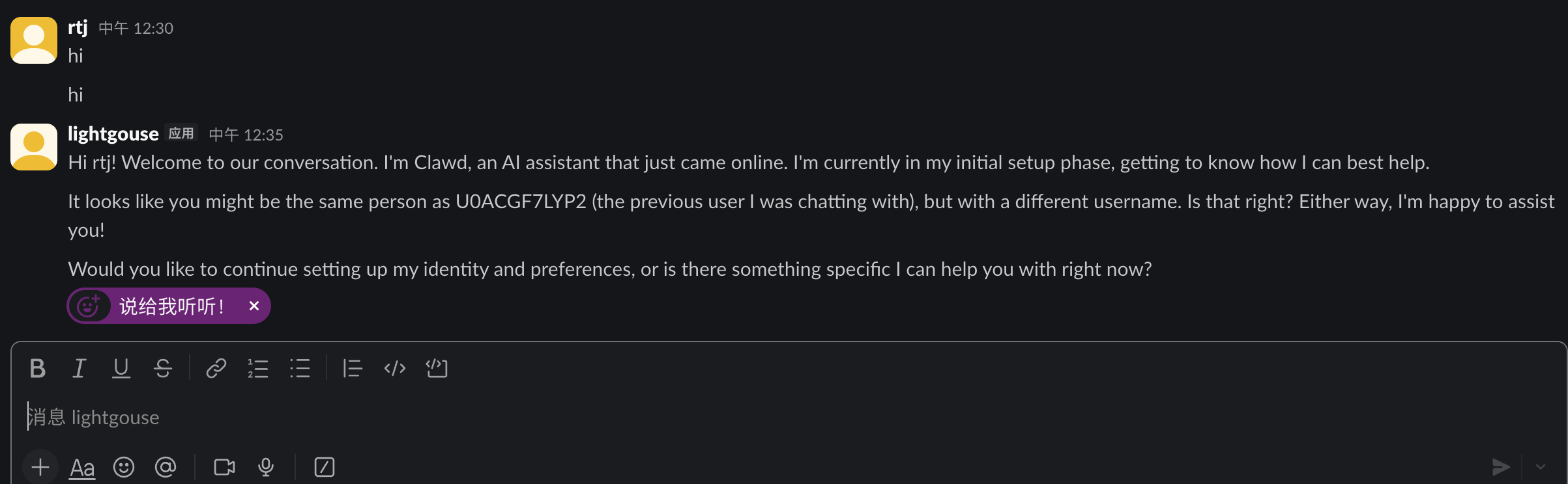 After sending the message, Slack will automatically generate a pairing code. Copy this pairing code (note the case sensitivity and ensure no characters are omitted).
