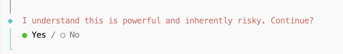 运行上面的命令后,将会出现一个确认选项:是否知晓风险,选择 Yes 。