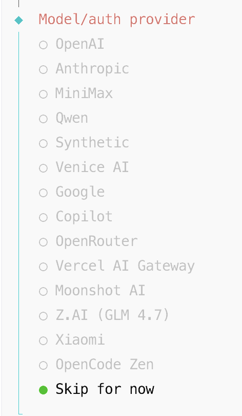 此步骤需要选择Model/auth provider,即配置模型。如果前面步骤中已在腾讯云控制台中完成了OpenClaw的模型配置,可以跳过此步骤。如果尚未进行模型配置,可以在此步通过命令行配置模型API Key。