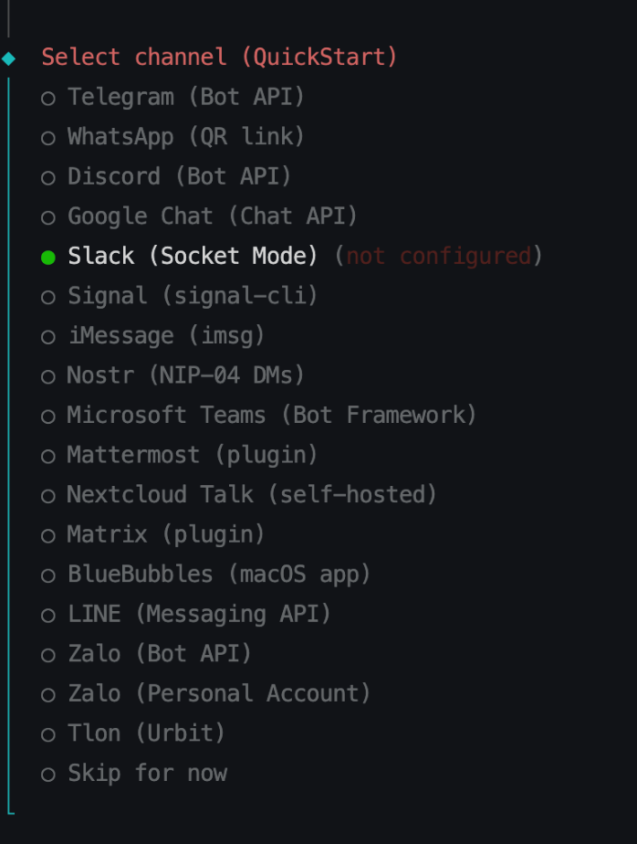 接下来进入 Select channel 步骤,通过键盘方向键选中 Slcak (Socket Mode) ,并且回车确认。