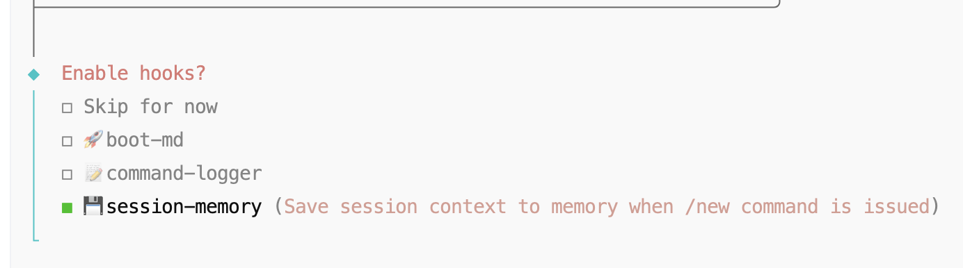 推荐只选择: session-memory (按键盘的上下箭移动光标,空格键选中,回车键确认进入下一步)