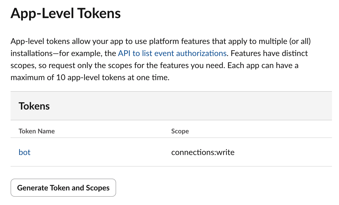 左侧导航栏切换至Basic Information(基础信息)页面,下拉找到App-Level Tokens,点击Generate Token and Scopes。